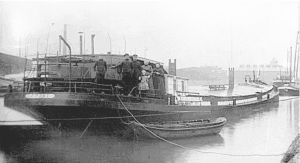 Six Rijnkasten were sometimes towed at the same time and in doing so the tow rope between the ships sometimes broke which was very dangerous because of the current in the Rhine. The ships were also sometimes tied together two by two and they went up and down. They were towed by steam tugs.